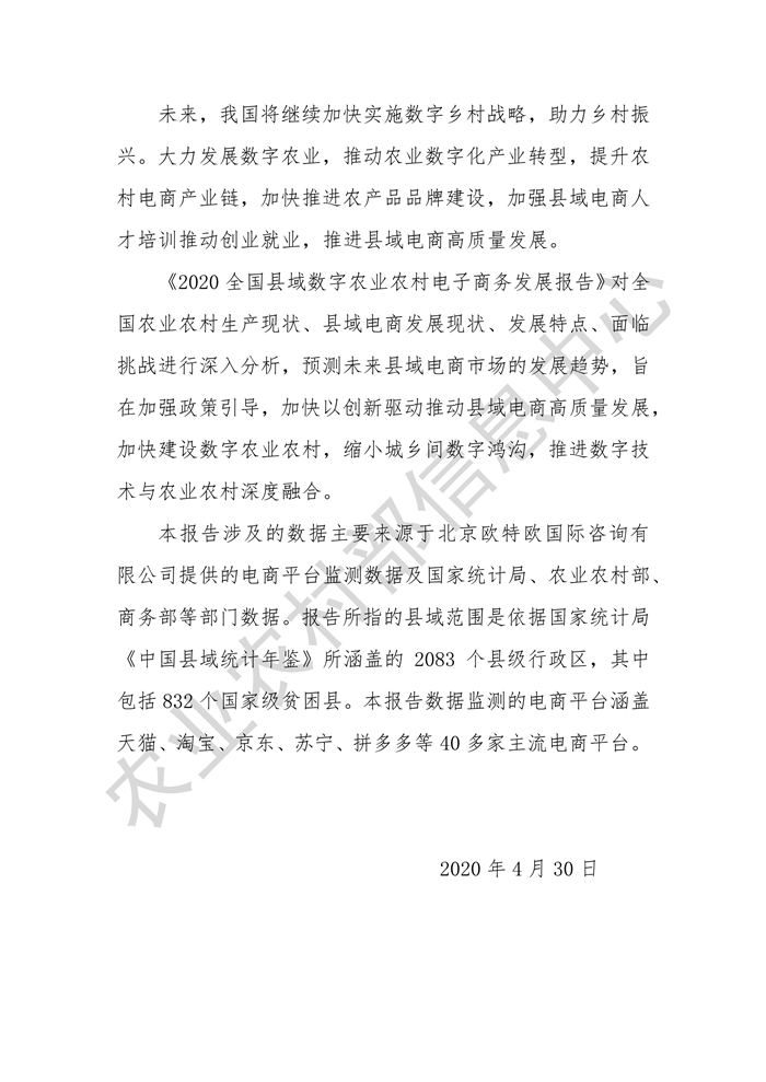 4月30日,農(nóng)業(yè)農(nóng)村部信息中心聯(lián)合中國國際電子商務(wù)中心研究院在京舉辦《2020全國縣域數(shù)字農(nóng)業(yè)農(nóng)村電子商務(wù)發(fā)展報(bào)告》線上發(fā)布會(huì)。